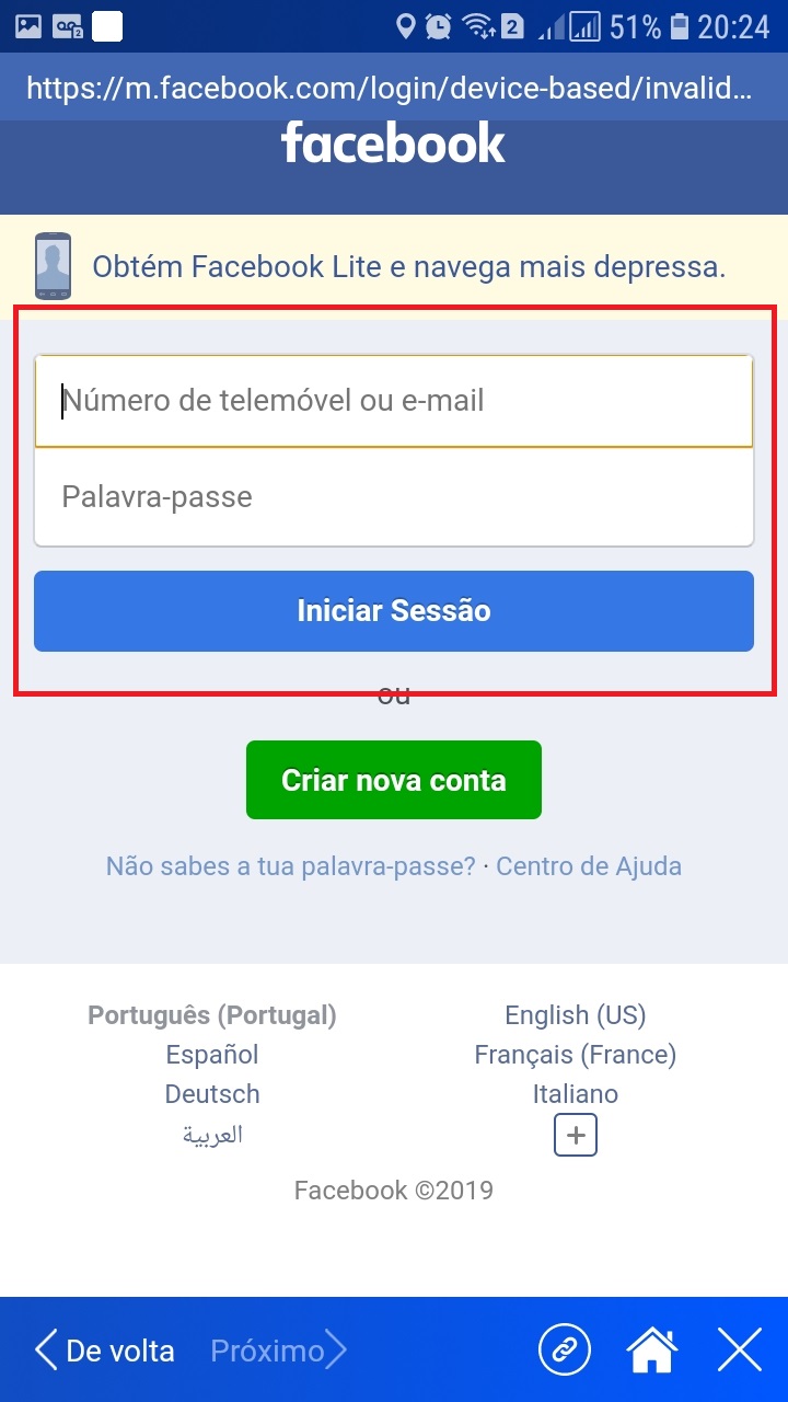 3 – Agora, você vai precisar fazer login com seu email e senha, para acessar a página inicial do Facebook.
